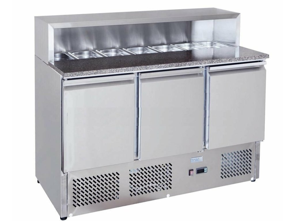 Pizza saladeta, celonerezové provedení s plnými dveřmi, vrchní nerezový hygienický zákryt a žulová pracovní deska. Vnitřní roštová police GN1/1 (1x ve dveřích). Vnitřní i vnější části jsou vyrobeny z nerez oceli se zaoblenými rohy ve spodní části. Vnitřní roštové police s plastem pokryté oceli, v nerezových výškově nastavitelných zásuvech. Izolovaná dvířka s automatickým zavíráním a vyměnitelným těsněním. Izolace stěn (60 mm). Ventilovaný oběh vzduchu pro intenzivnější udržení teploty ve všech úrovních komory. Přehledné elektronické ovládání s ukazatelem nastavené a aktuální teploty, síťový vypínač. Automatické odtávání a odpařování kondenzátu. Model je dodáván bez GN.
