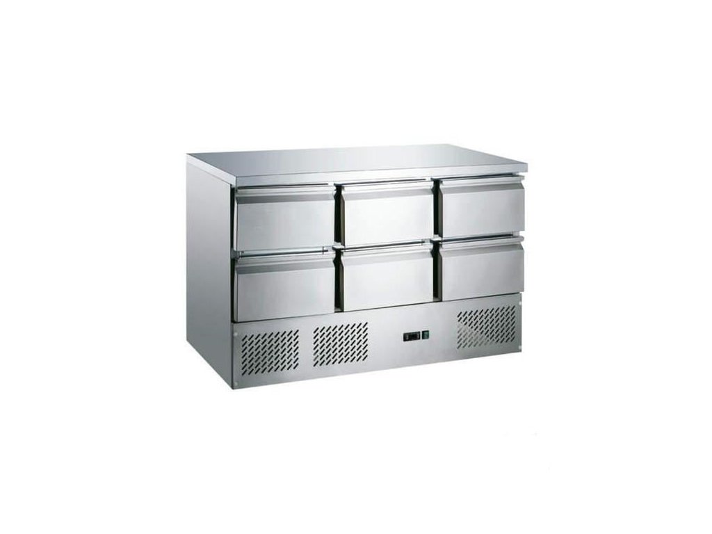 Chladící stůl v celonerezovém provedení, 6x zásuvka pro GN 1/1 a nerezovou pracovní deskou bez zadního lemu. Vnitřní roštová police GN1/1 (1x ve dveřích). Vnitřní i vnější části jsou vyrobeny z nerez oceli se zaoblenými rohy ve spodní části. Vnitřní roštové police s plastem pokryté oceli, v nerezových výškově nastavitelných zásuvech. Izolovaná dvířka s automatickým zavíráním a vyměnitelným těsněním. Izolace stěn (60 mm). Ventilovaný oběh vzduchu pro intenzivnější udržení teploty ve všech úrovních komory. Přehledné elektronické ovládání s ukazatelem nastavené a aktuální teploty, síťový vypínač. Automatické odtávání a odpařování kondenzátu. Model je dodáván bez GN.